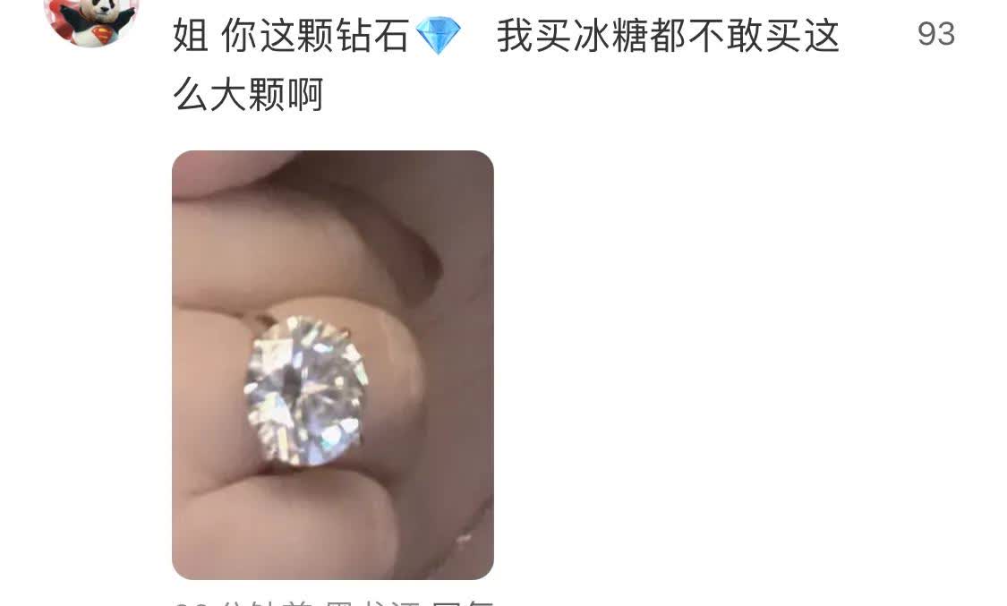 李湘另一只手上戴了一颗鸽子蛋大钻戒,网友称自己买冰糖都不敢买这么大颗的。