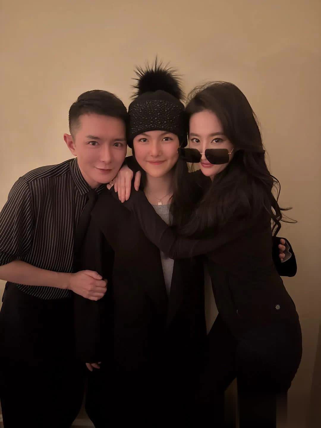 这场聚会上VOGUE杂志的主编刘冲也来了,刘冲和刘亦菲一起搂着王诗龄合影,王诗龄这就和VOGUE牵上线了,她离登上VOGUE杂志不远了。刘亦菲用手扶住墨镜,她的表情好灵动俏皮啊,她在这场聚会上的心情不错。